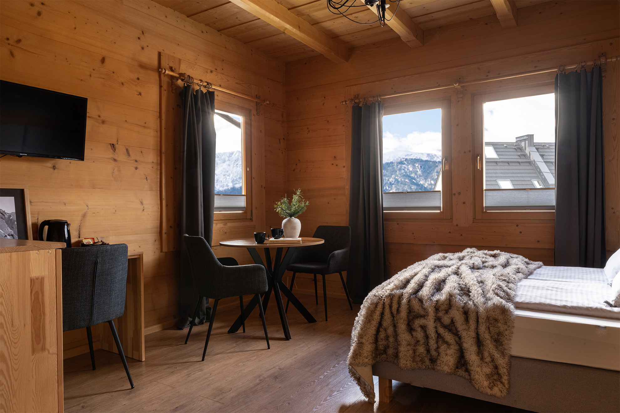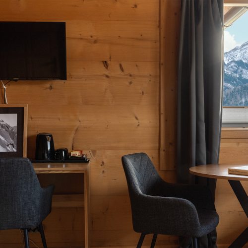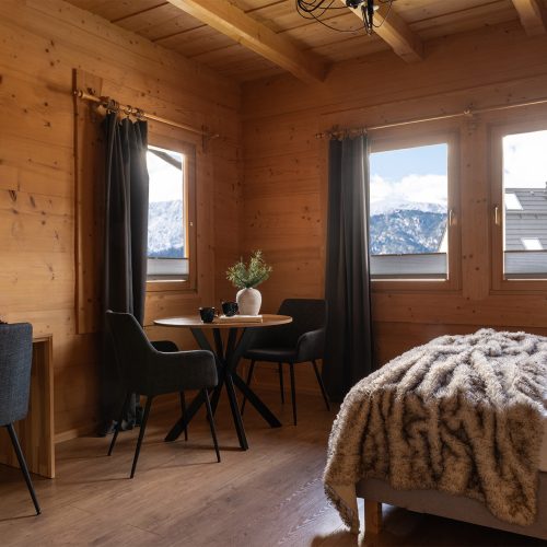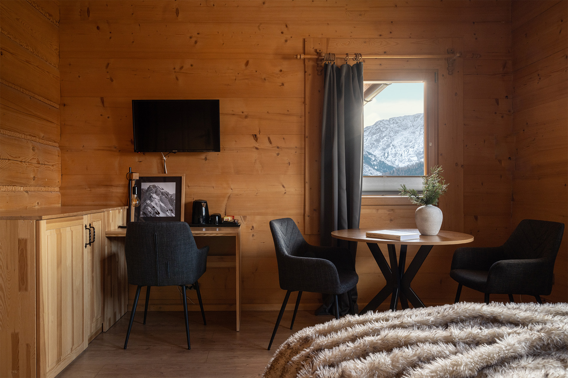 Klimatyczny, przestronny pokój dwuosobowy. Prosty, minimalistyczny wystrój podkreśla piękno tradycyjnych elementów, charakterystycznych dla góralskiej architektury.